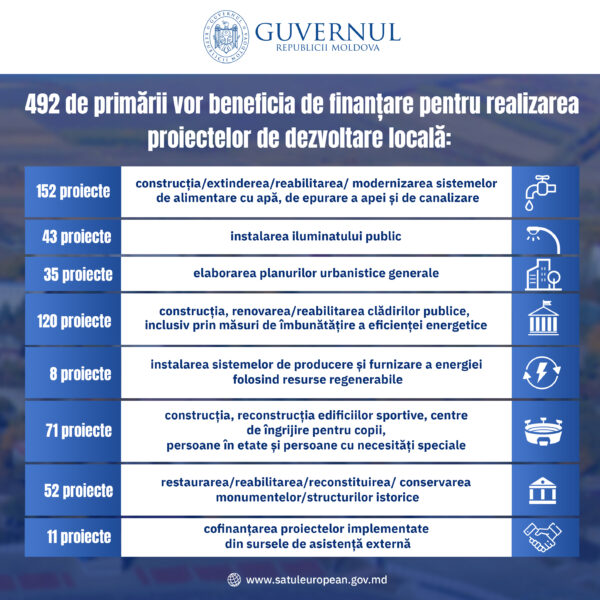 – 152 sunt destinate construcției/extinderii/reabilitării/modernizării sistemelor de alimentare cu apă, de epurare a apei și de canalizare;